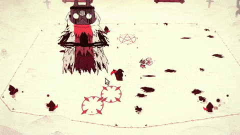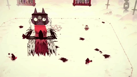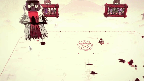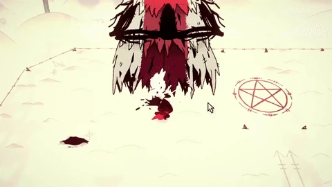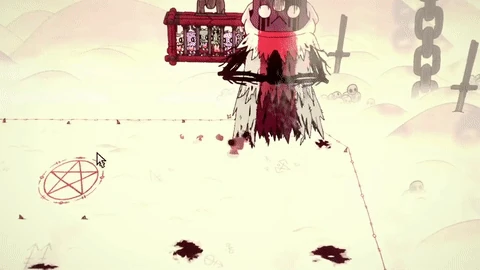 - (Kneel) The Lamb kneels. The Red Crown returns to The One Who Waits, and the Lamb is lifted up into the air, where their limbs begin to snap one by one, until finally, they die and their body is thrown on the ground.