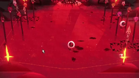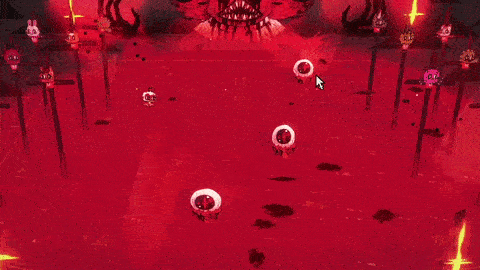 Narinder slams his hands on the ground and summons rings of fireballs that launch in pairs at the Lamb., increasing in speed with each pair launched.