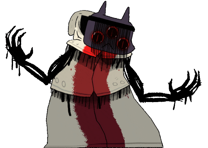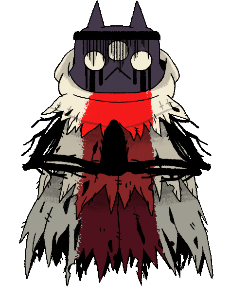 Narinder has dark gray, almost black fur, three eyes with red sclera and pupils and black irises, and two tall and pointed ears. His crown has two curved ears and a red eye, but he does not wear this for long as he gives it to The Lamb. The Lamb agrees to be his vessel. His face is covered by a veil made of black thread, similarly to his disciples, Aym and Baal, and the Knucklebones players Flinky, Klunko, and Shrumy.
