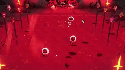 Accelerating Ring Pair Fireball Pattern: Narinder slams his hands on the ground and conjures three rings of fireballs on both sides of the arena and launches them in pairs at the Lamb at increasing speeds. It's recommended to Bleat to avoid taking damage from the last pair, as it moves so fast that it is easy to get hit by it.