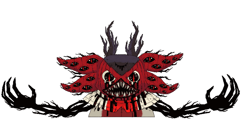 His face peels into four slices that pull away, two on each side, all containing extra eyes. These eyes are black with crossed red pupils. The top two slices each have four eyes while the lower two each have five. Including the three he already has, Narinder has 21 total eyes, though the third eye on his forehead remains closed. His two main eyes appear to be dripping white fluid and his pupils have a line through the middle similar to the crosses on his additional eyes. His arms and hands remain skeletal and branched, and black branches extend from the strips of flesh from his face. Black liquid pours from his eyes, his neck, and his mouth. His ears grow much larger and are similarly branched, though remaining dark gray. He has three rows of teeth: the first row has 8 on the top jaw and 6 on the bottom, the second row has 7 on the top jaw and 6 on the bottom, and the third row has 8 on the top and 8 on the bottom.